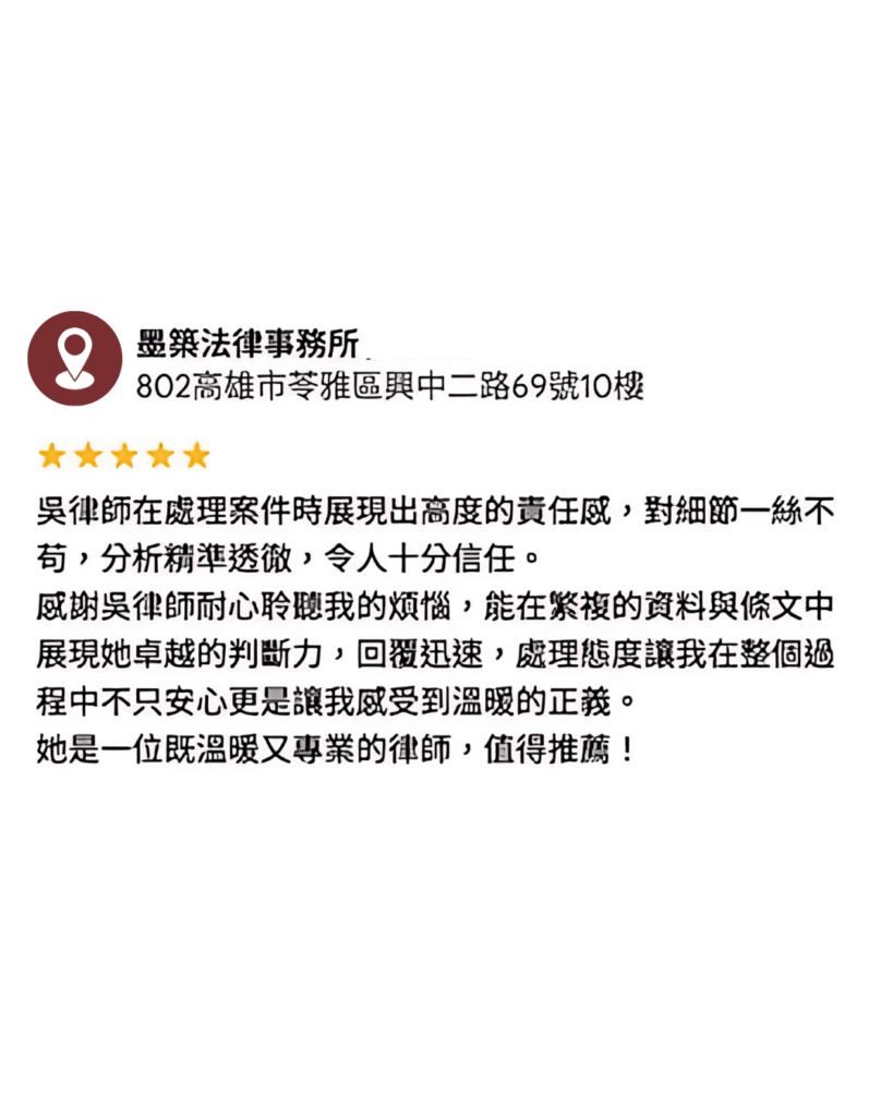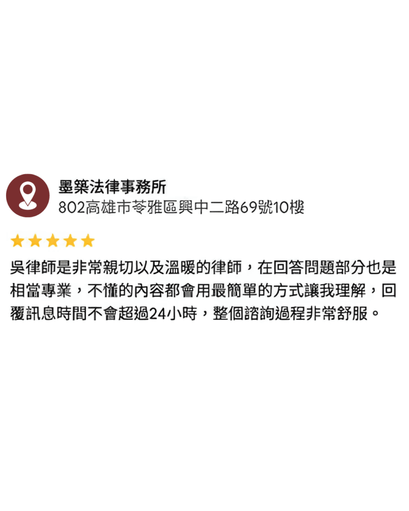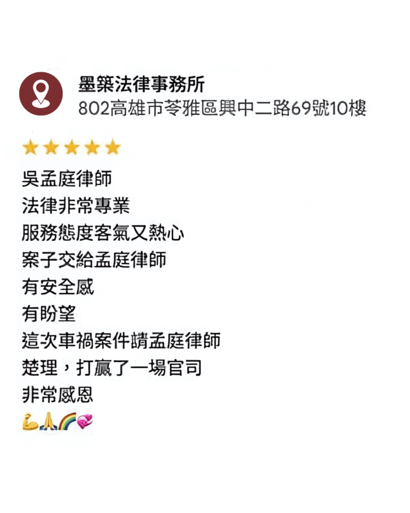 不確定下一步該怎麼辦? 墨築法律事務所成為您最堅實的後盾 為您量身制定兼具效率與人性關懷的法律解決方案 預約諮詢 免費法律諮詢線上|實體 聽得懂的法律建議 立即掌握重點及方向! 案件評估 為您的法律訴訟提供初步案件評估並報價 可以充分思考再委任輕鬆0壓力 公司法律顧問 讓法律成為公司穩健經營的助力 1、3、5年期法律顧問契約 Team 專業團隊 吳孟庭 / 主持律師 土地暨不動產相關爭議、政府採購法、勞工爭議、行政爭訟、家事婚姻監護… 學歷 / 經歷 國立政治大學法律系 學士現任 墨築法律事務所主持律師現任 財團法人法律扶助基金會扶助律師現任 豐盛建設開發有限公司法律顧問現任 鑫吉利國際有限公司法律顧問現任 鴻築吾江社區法律顧問現任 桃園市政府法律諮詢律師現任 高雄市政府法律諮詢律師現任 桃園律師公會到校宣導講師曾任 佑勝律師事務所受雇律師曾任 佑勝律師事務所實習律師 專業證照 律師應屆高考及格(財稅組)消費者債務清理專科律師培訓合格校園修復式正義培訓合格語言: 中文、台語 英文(多益金色證書) Consultation 諮詢預約 預約諮詢 營業時間 週一~週五 09:00~17:30 來電預約 0976-690-523 非營業時間 填寫預約諮詢表單 (專人於營業時間回覆並安排預約) 諮詢方式 來所諮詢 高雄所:高雄市苓雅區興中二路69號10樓 桃園所:桃園市中壢區永裕路151號 Line線上諮詢 Line ID:@677hazlm 諮詢費用 支付諮詢費 第一次諮詢 : 免費 第二次開始 : NT$ 5000元/hr Client Feedback 客戶反饋 News 最新文章 勞動基準法加班工時修正草案重點與影響|完整解析與自保清單 2025 年 9 月 21 日 尚無留言 導言 行政院公布勞動基準法修正草案後,「勞動基準法 閱讀更多 » 勞資糾紛該怎麼解決?勞工與雇主必知的法律保障 2025 年 9 月 20 日 尚無留言 導言 當勞資雙方就薪資、工時、加班費或資遣產生歧見 閱讀更多 » 面對刑事案件,如何保障自身權益? 2025 年 9 月 20 日 尚無留言 導言 身陷刑事程序時,第一時間的判斷往往決定往後權 閱讀更多 » 房地產糾紛怎麼處理?律師的專業建議 2025 年 9 月 20 日 尚無留言 導言 不動產交易金額高、文件多、週期長,一個小疏忽 閱讀更多 » 婚姻、監護與繼承——家事案件全解析 2025 年 9 月 20 日 尚無留言 導言 家事案件不只是官司,更牽動關係修復、親職安排 閱讀更多 » 遇到民事糾紛該怎麼辦?完整指南 2025 年 9 月 20 日 尚無留言 導言 民事爭議橫跨交易、工程、借貸、名譽、侵權與消 閱讀更多 »